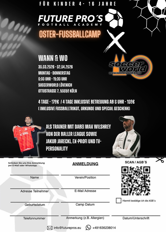 In den Osterferien bieten wir in Kooperation mit der Future Pros Football Academy in der SoccerWorld Köln wieder ein Fußballcamp für Kids von 4-16 Jahren an.